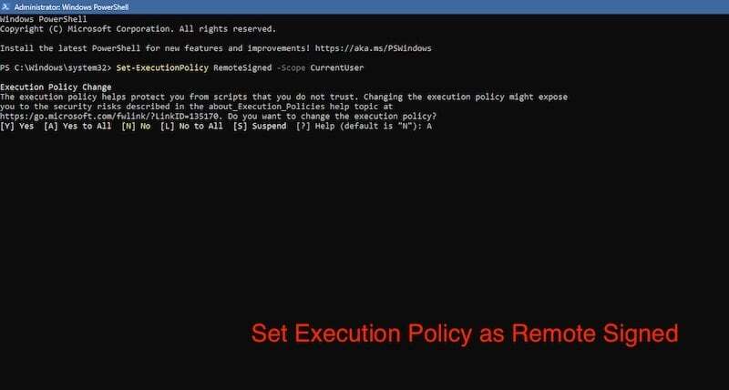 - 다음 명령을 입력하여 실행 정책을 원격 서명 또는 모두 서명으로 설정합니다. Set-ExecutionPolicy RemoteSigned -Scope CurrentUser