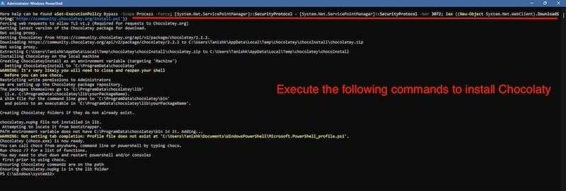 - 그런 다음 아래에서 다음 명령을 붙여넣어 실행 정책을 All-Signed 또는 Bypass -Scope 프로세스 로 설정합니다. Set-ExecutionPolicy Bypass -Scope Process -Force; [System.Net.ServicePointManager]::SecurityProtocol = [System.Net.ServicePointManager]::SecurityProtocol -bor 3072; iex((New-Object System.Net.WebClient).DownloadString('https://community.chocolatey.org/install.ps1'))
