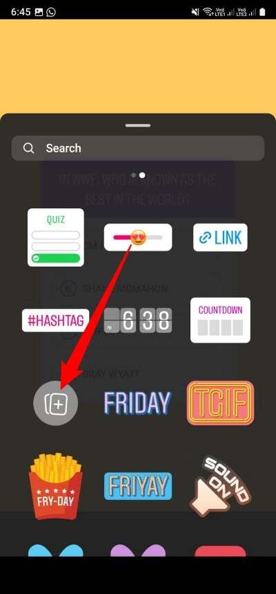 - 스티커 메뉴에서 퀴즈 아이콘을 찾을 때까지 아래로 스크롤하여 누릅니다. 그렇지 않으면 검색할 수도 있습니다.