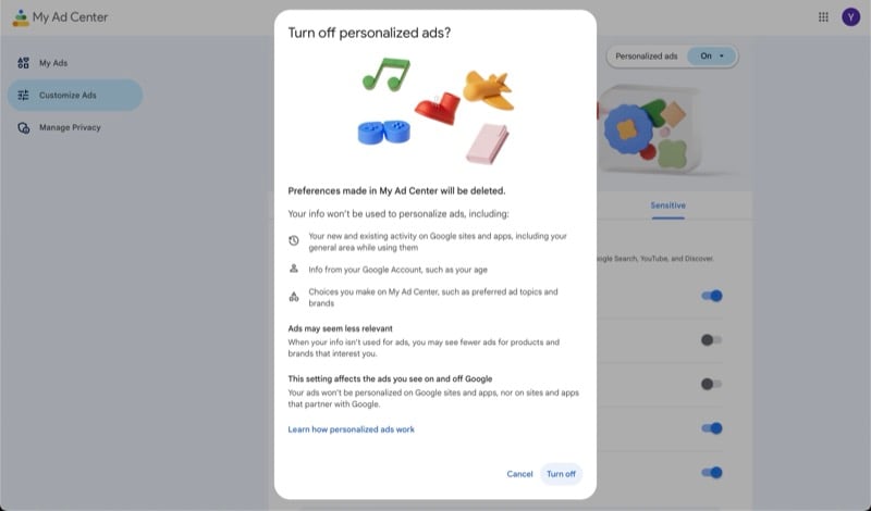 또는 YouTube에서 주류 및 도박 광고 표시를 최소화하는 또 다른 방법이 있습니다. 여기에는 개인화된 광고를 완전히 끄는 것이 포함됩니다. 이렇게 하려면 내 광고 센터 대시보드 에서 개인화된 광고 버튼을 클릭 한 다음 끄기를 클릭하세요