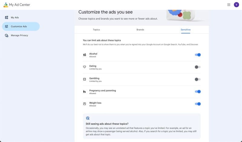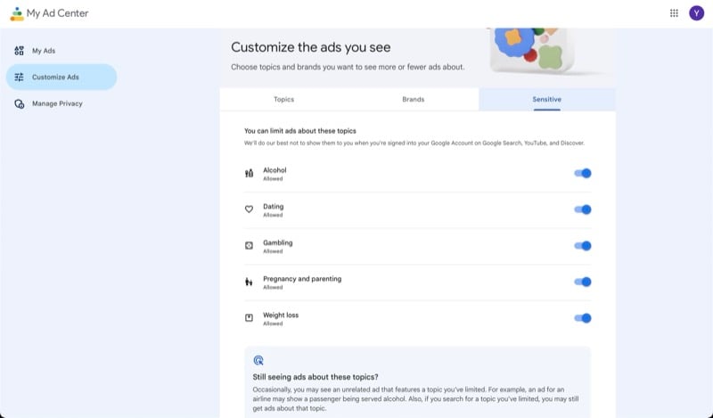 내 광고 센터 대시보드에서 주류, 도박 및 기타 민감한 주제를 해제하면 앞으로는 더 적은 수의 주제가 표시됩니다. 그러나 Google은 이러한 광고를 완전히 차단한다고 보장하지 않으므로 인터넷에서 해당 광고를 적극적으로 검색했거나 다른 광고의 일부이기 때문에 이러한 광고가 나타날 가능성이 있습니다.