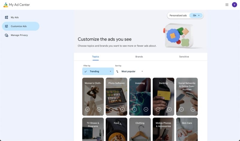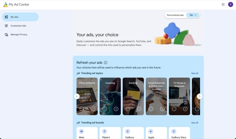 YouTube에서 주류 및 도박 광고를 선택 해제하려면 광고 관심설정을 맞춤설정해야 합니다. 아래와 같이 Google 계정의 내 광고 센터 대시보드에서 이 작업을 수행할 수 있습니다.