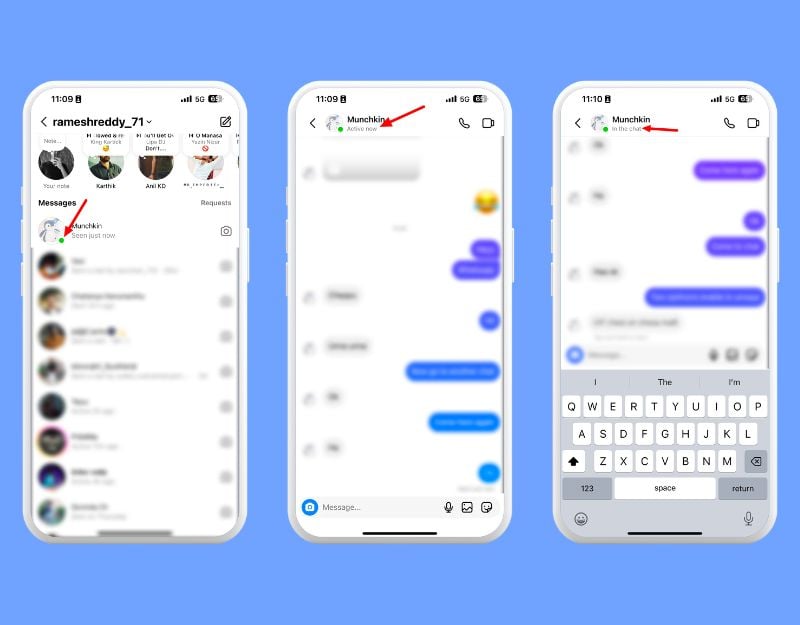 이미지 1: 해당 사람이 Instagram이나 다른 채팅에서 활동 중입니다 | 이미지 2: 해당 사람이 Instagram 앱이나 다른 채팅에서 활동 중입니다| 이미지 3: 해당 사람은 Instagram에서 활동 중이며 동일한 채팅을 보고 있습니다.