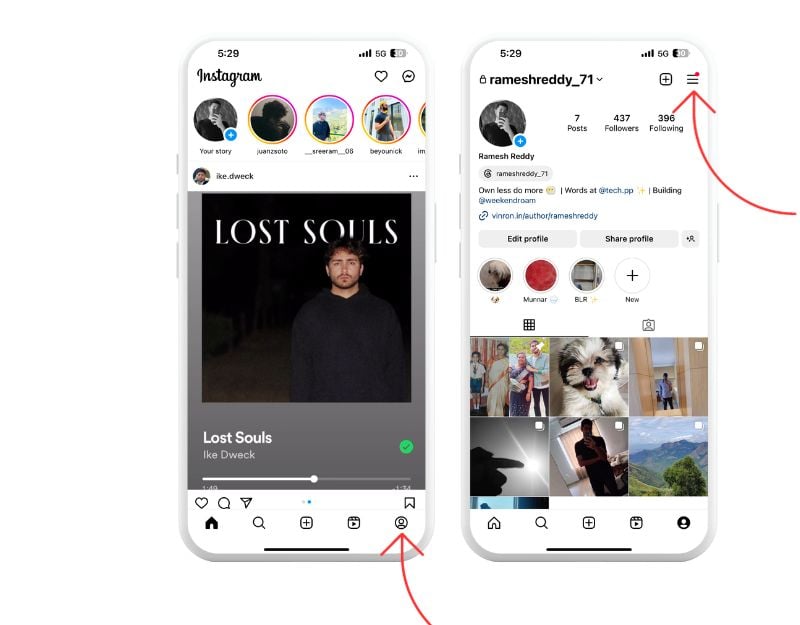 - Instagram 앱을 열고 화면 왼쪽 하단에 있는 프로필 사진을 클릭하세요.