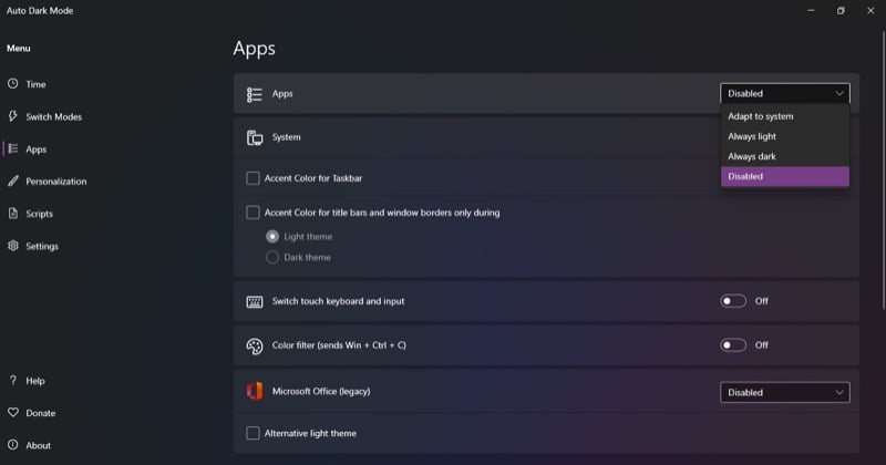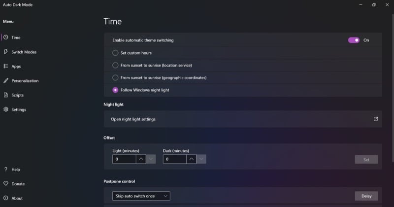 윈도우 10 및 윈도우 11에서 다크 모드를 예약하는 가장 쉬운 방법은 자동 다크 모드 앱을 사용하는 것입니다. 무료 앱이며 Windows 10 또는 Windows 11 PC에서 밝은 모드와 어두운 모드 사이를 자동으로 전환하도록 일정을 설정할 수 있습니다.