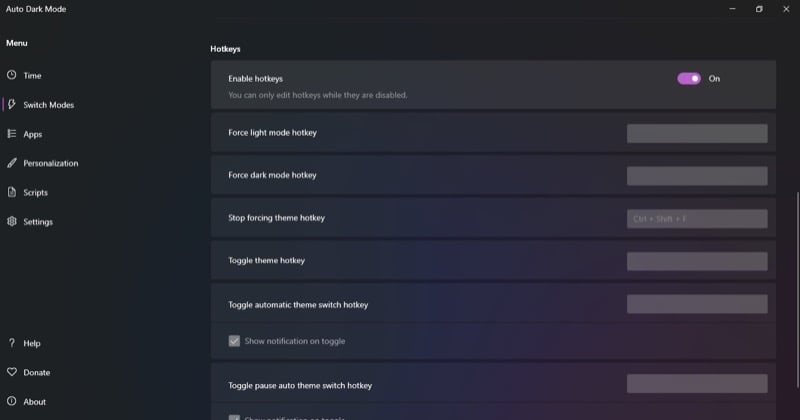 또 다른 유용한 자동 다크 모드 옵션은 단축키입니다. 단축키를 사용하면 무엇보다도 테마를 전환하거나, 테마 전환을 강제하거나, 전환을 중지할 수 있습니다.