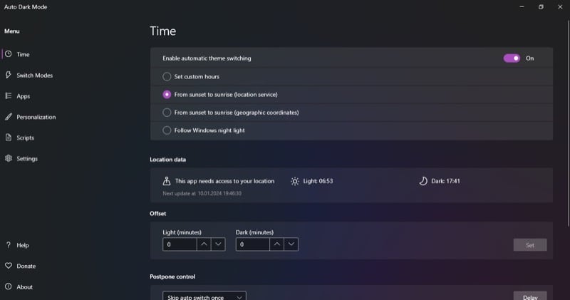 자동 다크 모드는 자동으로 위치를 감지하고 일출 및 일몰 시간을 설정합니다.