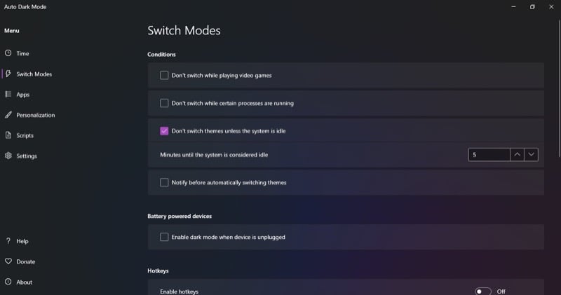 또는 시스템이 유휴 상태일 때만 테마를 전환하도록 자동 다크 모드에 지시할 수 있습니다. 이렇게 하려면 시스템이 유휴 상태가 아니면 테마를 전환하지 마십시오 확인란을 선택합니다. 그런 다음 유휴 시간을 설정하십시오.