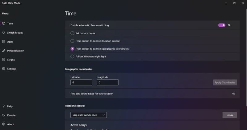 자동 다크 모드 앱에서 라이트 모드와 다크 모드 전환을 예약하는 또 다른 방법은 지리적 좌표를 지정하는 것입니다. 이 기능이 제대로 작동하려면 위치의 정확한 위도와 경도를 입력해야 합니다.