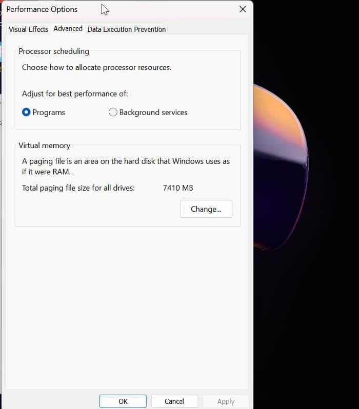 5. 그런 다음 가상 메모리 섹션에서 변경을 클릭하여 컴퓨터의 가상 메모리 설정을 수정합니다.