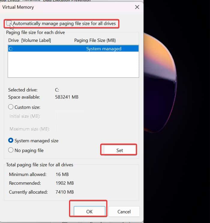 9. 이제 가상 메모리 창 하단의 확인을 클릭하여 변경 사항을 적용합니다.