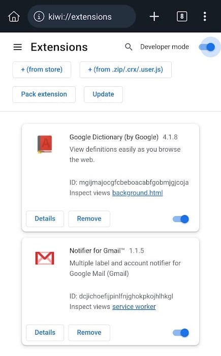 kiwi://extensions 또는 chrome://extensions를 입력하여 설치된 확장 프로그램을 찾으세요. 새 확장 프로그램을 설치하려면 모바일 브라우저에서 Chrome 웹 스토어를 방문하세요.