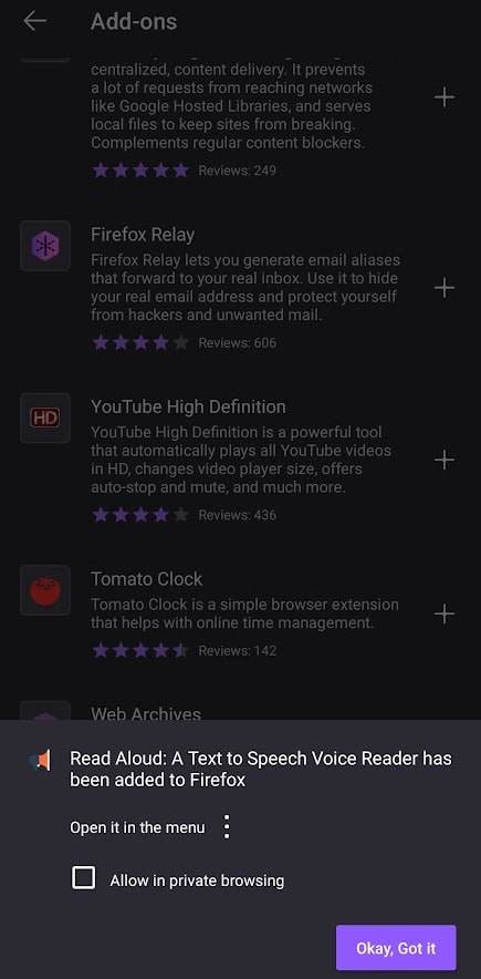 더 자세히 알아보고 싶다면 addons.mozilla.org/en-GB/Android 로 이동하여 Android 관련 확장 프로그램을 확인하세요. 추가 기능 옵션 에서 설치된 확장에 액세스하여 사용할 수 있습니다. 시각적으로 변경되는 추가 기능은 사용자 입력 없이 자동으로 적용될 수 있습니다.