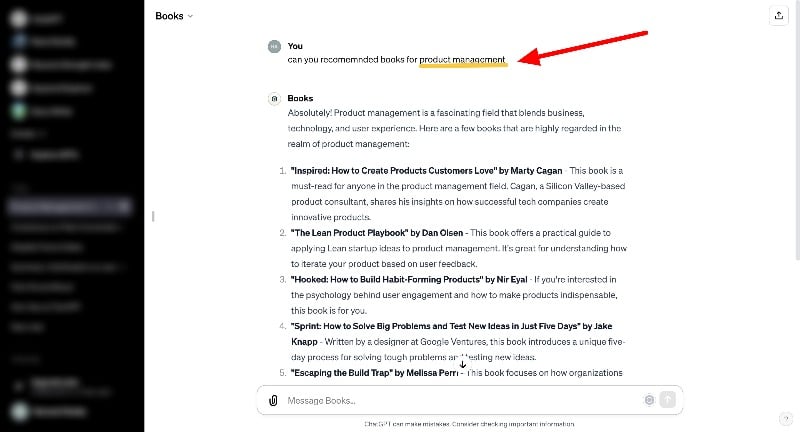 도서 맞춤 GPT는 완전 무료입니다. 쉽게 찾아보고 나만을 위한 맞춤형 책의 세계를 탐험해 보세요. 최근에 제품 관리를 배우기 시작했고, 봇에게 제품 관리를 배우기에 가장 좋은 책을 요청했습니다. 봇은 제품 관리에 관한 책 5권을 추천했는데, 이는 제품 관리자의 추천과 동일합니다.