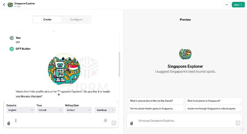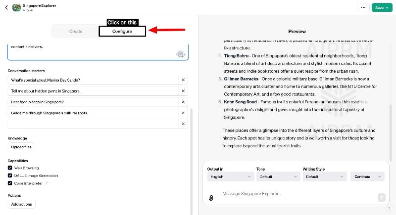 - 이 경우 싱가포르 최고의 관광지를 추천하기 위해 맞춤형 GPT를 구축하고 있습니다.