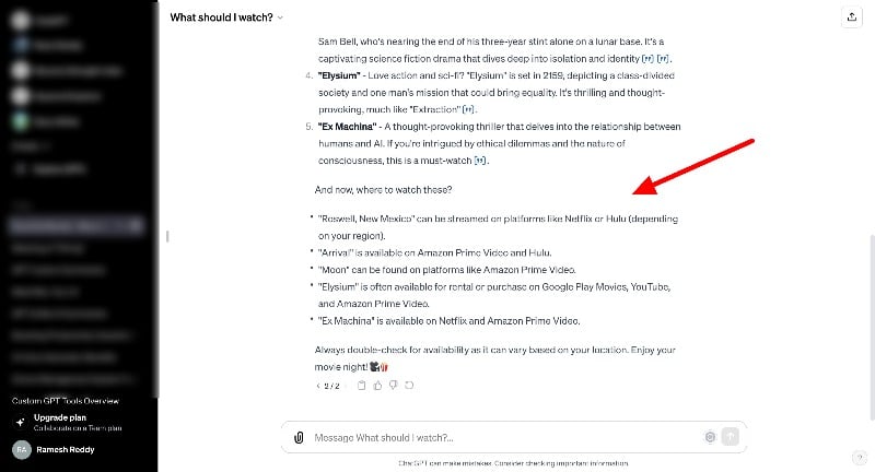 또한 봇은 Letterbox와 같은 다른 영화 추적 서비스에 연결하여 영화 추천을 제안합니다 봇은 코미디, 스릴러, 드라마, 로맨스, 공포 영화, 공상 과학 또는 기타 장르와 같은 장르별로 영화와 TV 프로그램을 제안할 수 있습니다.