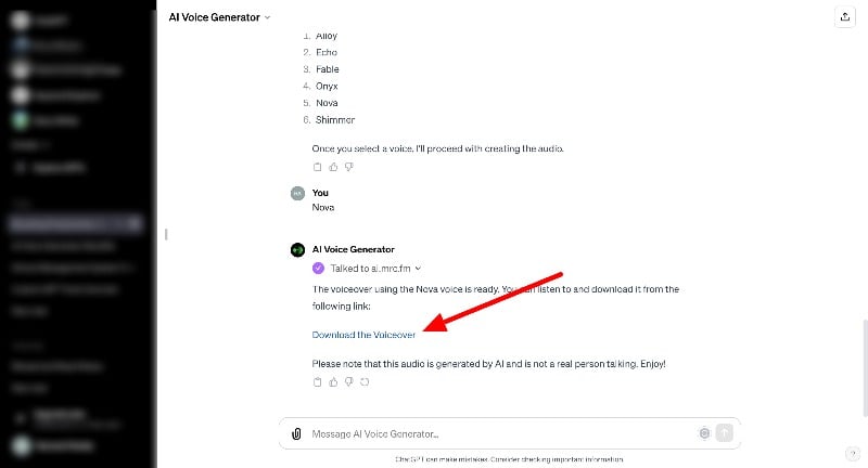 학생이나 학자라면 AI 음성 생성기를 사용하여 텍스트를 오디오로 변환할 수 있습니다. 프롬프트에 텍스트를 입력하면 오디오가 생성됩니다. 봇은 Alloy, Echo, Fable, Onyx, Nova 및 Shimmer를 포함하여 선택할 수 있는 다양한 음성을 제공합니다.
