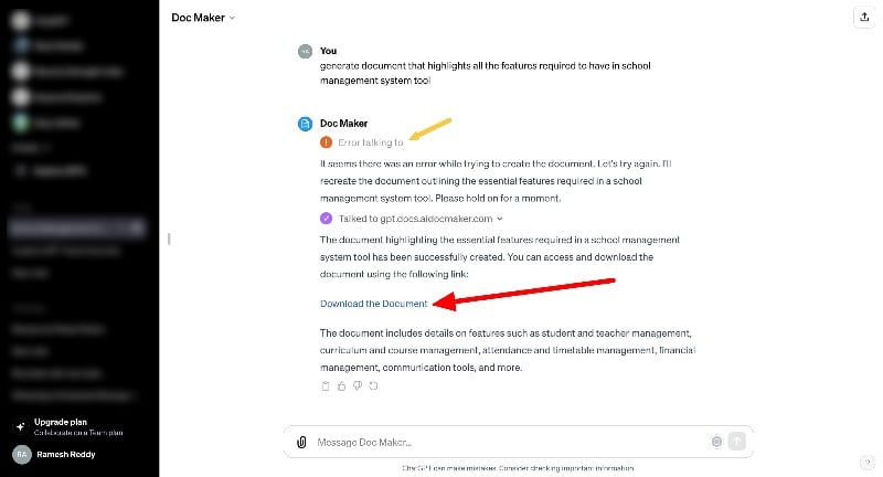 봇은 PDF, DOCX, PPTX, XLSX 및 CSV와 같은 일반적인 형식으로 문서, 프리젠테이션, 스프레드시트 및 이력서를 생성할 수 있습니다. 이 파일은 aidocmaker.com을 통해 Google Drive 및 OneDrive로 내보낼 수도 있습니다. 또한 봇은 Google Drive, OneDrive 및 기타 URL 기반 데이터 소스에서 파일을 읽어 정보를 수집하거나 이를 문서에 통합할 수도 있습니다. GPT 사용은 무료입니다. "탐색" 탭을 통해 Doc Maker에 액세스하고 전문가 수준의 문서, 스프레드시트 및 프리젠테이션을 무료로 만들 수 있습니다.