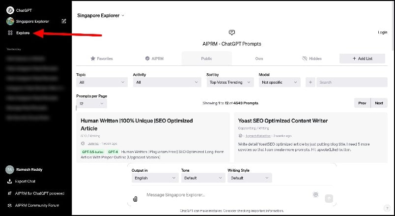 - chat.openai.com을 방문하여 사이드바에서 탐색을 클릭하세요.