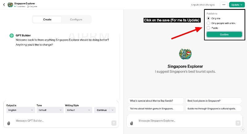 - 사용자 정의 chatGPT 모델을 저장하려면 저장을 클릭하세요. GPT를 비공개 또는 공개로 저장하고 링크가 있는 모든 사람과 공유할 수 있습니다.