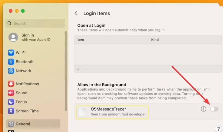 3. 이제 슬라이더 버튼을 통해 백그라운드에서 허용 에서 OSMessageTracer를 비활성화합니다.