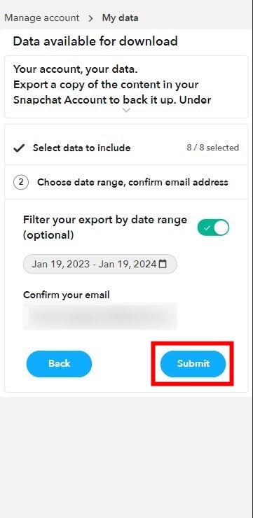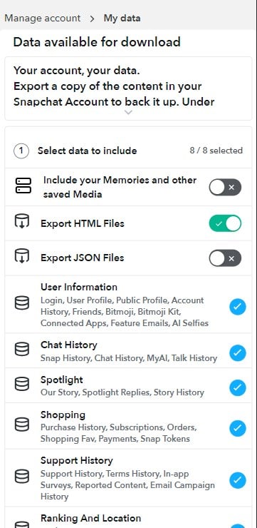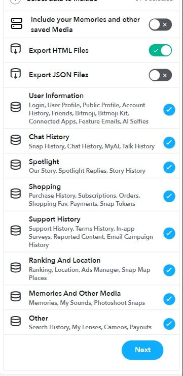 - Snapchat에서 다운로드하려는 모든 데이터를 선택하고 다음 을 클릭하세요