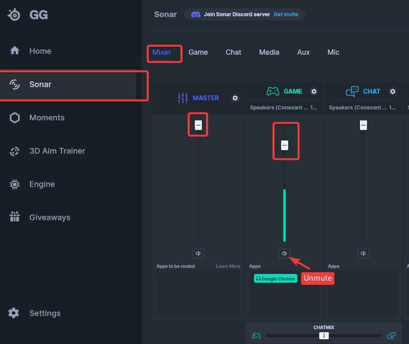 이러한 가능성을 제거하려면 Sonar 앱의 볼륨 막대를 확인하고 문제가 있는 출력에 대한 볼륨 제어가 음소거되어 있지 않은지 확인하십시오.