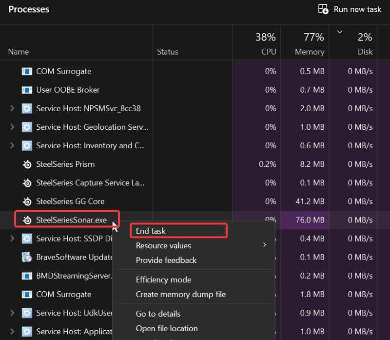 2. 프로세스 탭에서 SteelSeries GG 프로세스를 검색하십시오