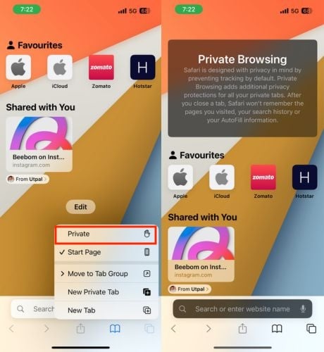 - 메뉴가 나타나면 비공개를 선택하세요. 또는 (숫자) 탭을 비공개 방향으로 오른쪽으로 밀고 탭하여 비공개 브라우징 모드에 액세스할 수 있습니다.