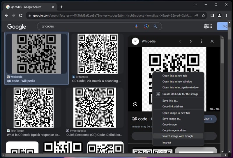 - QR 코드를 마우스 오른쪽 버튼으로 클릭하고 Google로 이미지 검색을 선택합니다