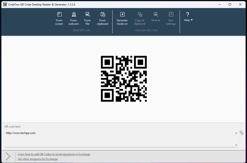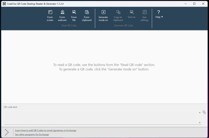 이러한 요구 사항을 충족하려면 타사 QR 코드 스캐너가 필요합니다. 사용할 수 있는 QR 코드 리더가 많이 있지만 CodeTwo의 QR Code Desktop & Generator를 권장합니다. 무료이며 더 나은 UI 중 하나를 갖추고 있으며 QR 코드를 생성하는 데 도움이 되는 코드 생성기를 제공합니다.
