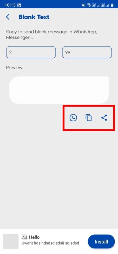 - WhatsApp 복사 및 공유 버튼 이라는 세 개의 버튼이 표시됩니다 WhatsApp 버튼을 사용하여 WhatsApp 연락처에 빈 메시지를 직접 보낼 수 있습니다. 다른 메시징 앱에서 빈 메시지를 보내려면 복사 버튼을 선택할 수 있습니다.