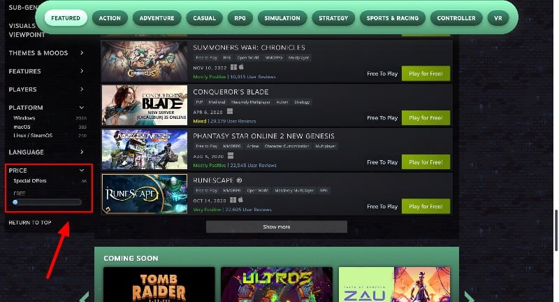 - 카테고리를 클릭 하고 아래로 스크롤한 후 필터 탭에서 가격표를 찾아 무료로 이동하세요 .