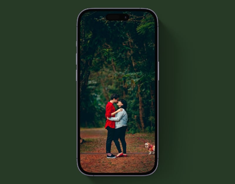이 배경화면에는 귀여운 강아지와 함께 숲에서 사랑을 나누는 두 사람의 모습이 담겨 있습니다. 평화로운 장소에서 특별한 순간을 담아낸 배경화면이며, 조용하고 자연스러운 장소에서 사랑을 표현하기 때문에 발렌타인데이에 딱 맞습니다.