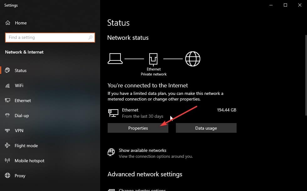 2. 상태 페이지에서 인터넷 속성 으로 이동합니다.