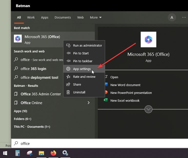 1. 시작 메뉴 검색에서 마우스 오른쪽 버튼 클릭 메뉴 검색을 통해 Office 설정으로 이동합니다.