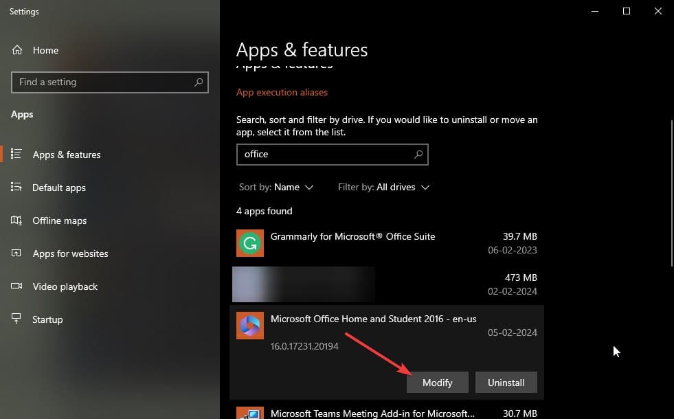 2. 목록에서 Microsoft Office를 찾아 이름 옆에 있는 수정을 클릭합니다.