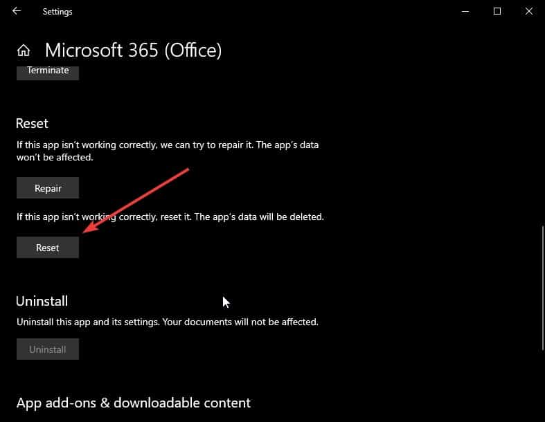 2. 설정에서 아래로 스크롤하고 재설정을 클릭하여 Office 데이터를 삭제합니다. 그러면 마치 새로 설치된 것처럼 앱이 새로 시작됩니다.
