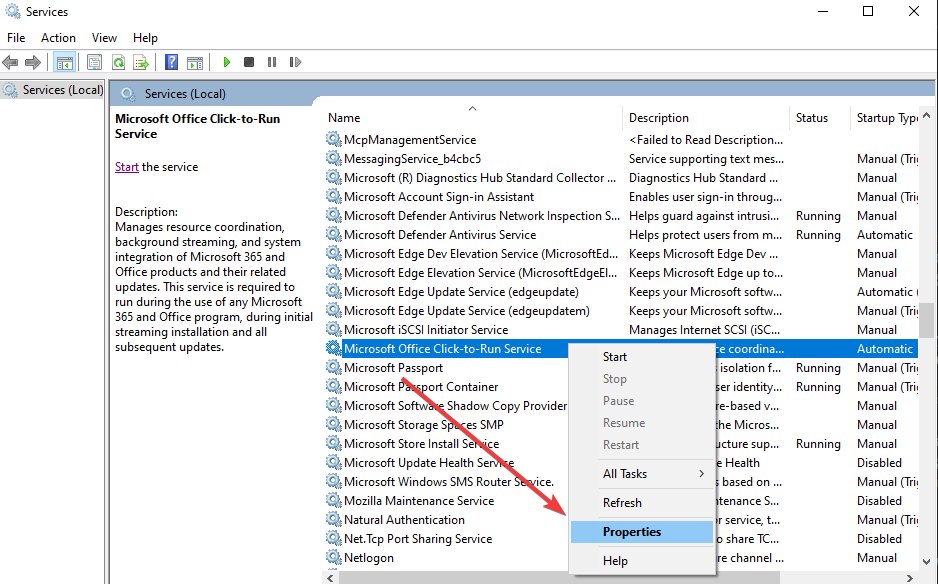 2. 마우스 오른쪽 버튼 클릭 메뉴에서 Microsoft Office 간편 실행 서비스 속성 으로 이동합니다.