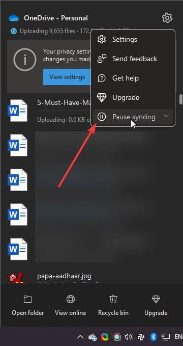 2. 설정 에서 톱니바퀴 아이콘을 통해 동기화 일시 중지를 선택하세요. 선택 사항에 따라 최대 24시간 동안 파일 동기화가 일시 중지됩니다.