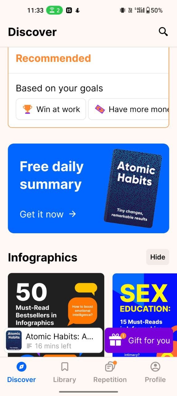 책 요약을 세 가지 방법으로 읽을 수 있습니다. 텍스트, 비디오, 오디오로 요약에 액세스할 수 있습니다. 이 앱은 또한 더 많은 시간을 절약하는 데 도움이 되는 인포그래픽과 마인드맵 요약을 제공합니다. 텍스트 기반 요약은 읽기 페이지로 직접 연결되는 반면, 비디오 기반 요약은 때때로 YouTube 비디오로 리디렉션되고 오디오 요약은 앱에서 직접 재생됩니다.
