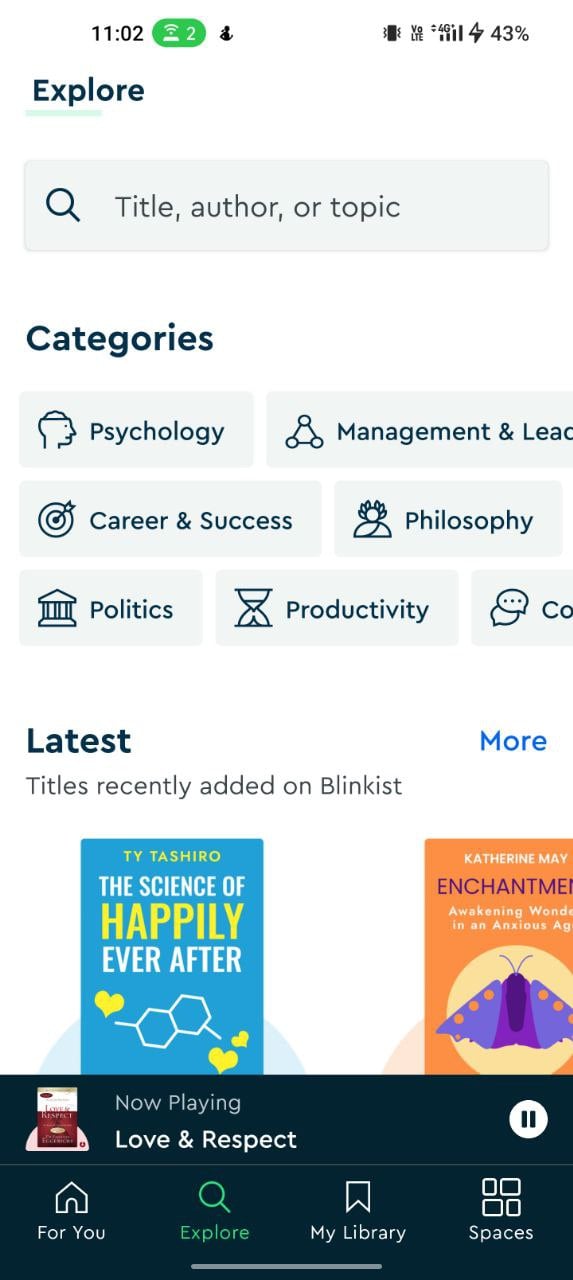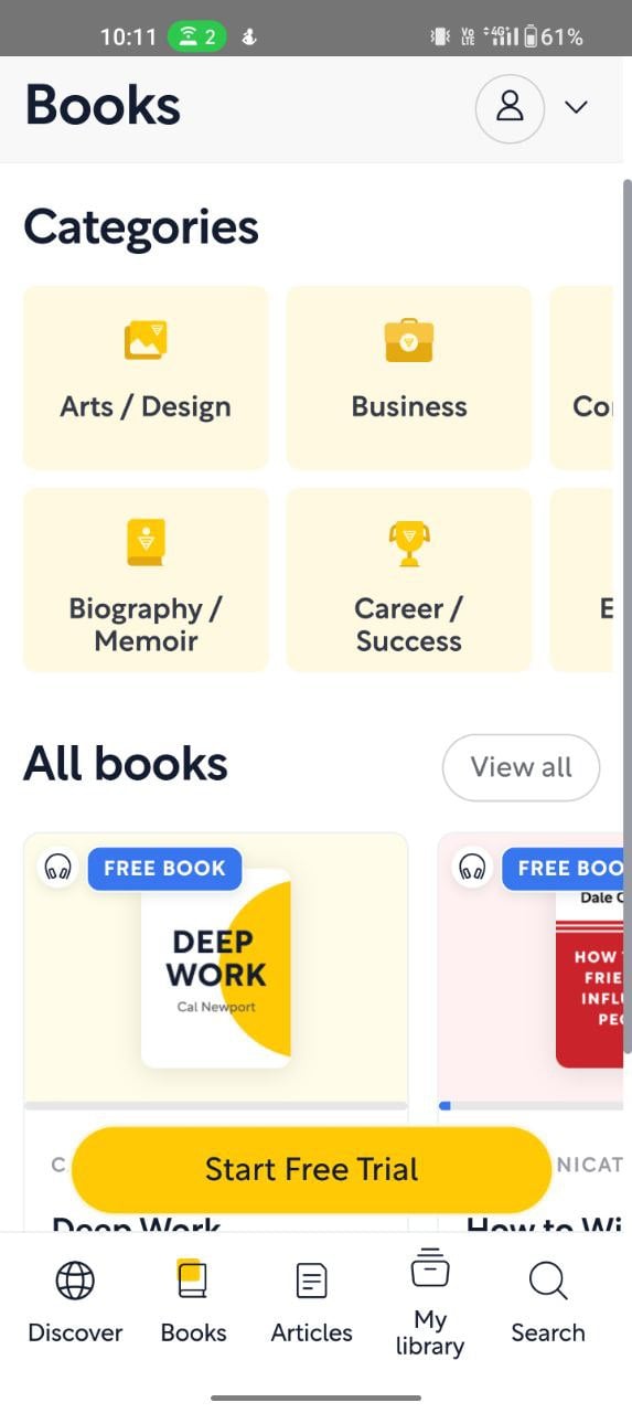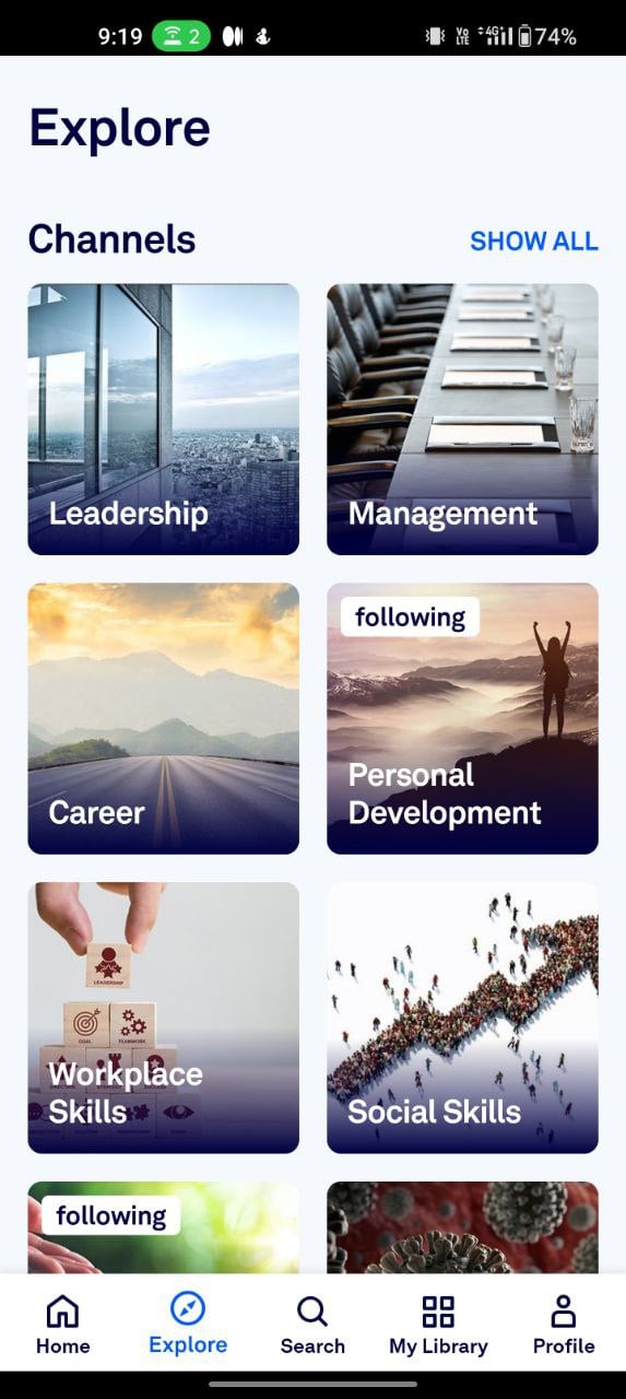 도서 선택부터 앱은 생산성, 개인 성장, 역사 및 전기, 심리학, 비즈니스, 정치, 데이트 및 관계 등과 같은 다양한 카테고리의 광범위한 도서를 제공합니다.