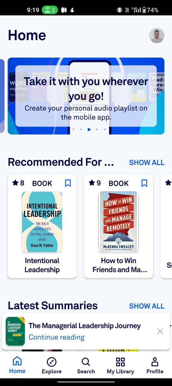 사용자 인터페이스는 명확하고 간단합니다. 귀하의 관심분야에 따라 앱은 홈 화면의 '추천' 탭에 책을 추천합니다. 이 앱에는 인기 콘텐츠, 편집자 추천 사항 등도 나열되어 있습니다. 홈 화면이나 '탐색' 탭에서 책을 직접 탭하면 책 요약을 즉시 읽을 수 있습니다.