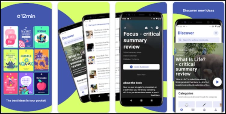 12min은 책 요약을 정기적으로 읽는 루틴을 설정하려는 경우 인기 있는 또 다른 책 요약 앱입니다. 이 앱은 사용자가 매주 특정 수의 책을 읽도록 권장하는 주간 과제가 포함된 다양한 책으로 구성되어 있습니다. 이 앱은 또한 일주일에 읽은 책의 수에 따라 사용자를 평가합니다.