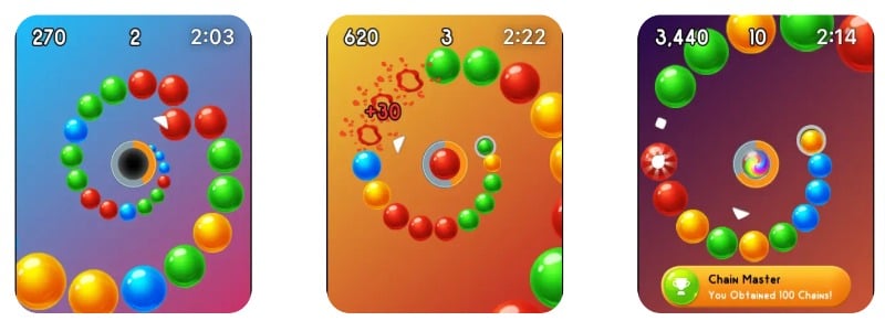 Vortigo 는 버블 슈팅 게임입니다. 업무 중에 또는 수업 시간에 지루함을 느끼며 슈팅 게임을 하고 싶다면 시간을 보내기에 아주 좋은 앱입니다. 게임의 컨셉은 거품을 쏘는 것입니다. 같은 색깔의 버블을 3개 이상 터뜨리는 것이 목표입니다. 게임은 끝이 없습니다. 원하는 만큼 많은 버블을 쏠 수 있습니다. 계속해서 거품을 터뜨리며 최고 레벨에 도달할 수 있습니다. 이 게임에는 폭탄, 무지개, 일시정지, 반전과 같은 독특한 버블도 포함되어 있습니다. 이 게임은 Apple Watch에서 0.99달러에 이용할 수 있습니다.