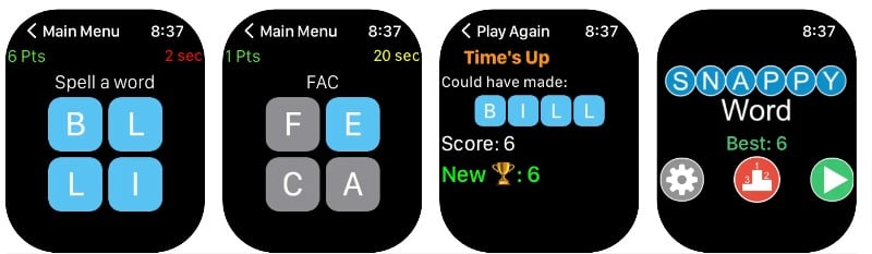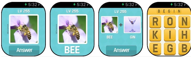 Pictoword 는 애플 워치 용 단어 퍼즐 게임입니다. 단어 추측 게임을 좋아한다면 이 게임도 좋아할 것입니다. 이 게임은 서로 결합되어 있고 단어를 추측해야 하는 일련의 그림을 제공합니다. 예를 들어, SAND 사진 뒤에 'WITCH'가 오면 'SANDWICH'라는 단어가 표시됩니다. Apple Watch에서 즐길 수 있는 재미있고 쉬운 게임입니다. 이 게임에는 300개 이상의 퍼즐이 포함되어 있으며 온라인 및 오프라인 게임 모드를 지원합니다.