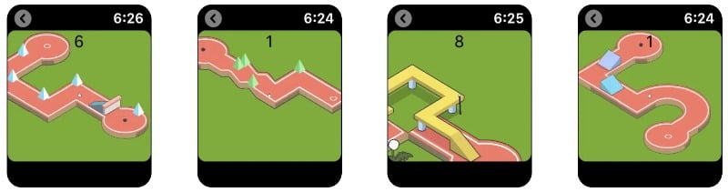 미니 골프는 Apple Watch에서 즐길 수 있는 인기 게임입니다. 디지털 크라운을 이용해 방향을 설정하고, 화면을 터치해 공을 넣을 수 있습니다. 이 게임은 iPhone 및 iPad에서도 사용할 수 있습니다. 이 게임에는 독특한 레이아웃을 갖춘 25개의 레벨이 있습니다.