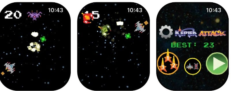 Kepler Attack은 애플 워치 용 아케이드 우주 슈팅 게임입니다. 이 게임은 복고풍 스타일의 그래픽을 제공합니다. 게임은 침략자를 공격하고 힘을 키워야 하는 우주에서 진행됩니다. Shield, Triple Shot, Rapid Fire 및 Smart Bomb로 우주선을 업그레이드할 수 있습니다. Apple Crown을 사용하여 게임을 제어할 수 있습니다. 이 게임에는 발렌타인데이, 크리스마스와 같은 특별한 테마가 있습니다. 그래픽이 좋다. 이 게임은 iPhone 및 iPad와도 호환되며 가격은 1.99달러입니다.