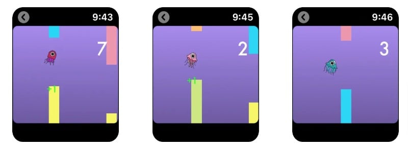 Jellyfish Tap은 간단하지만 시각적으로 매력적인 게임입니다. 이 게임은 인기 있는 헬리콥터 게임과 매우 유사합니다. 목표는 장애물을 피하고 높은 점수를 얻는 것입니다. 게임은 끝이 없습니다. 해파리가 장애물에 부딪치거나 상단 또는 하단 기둥에 부딪힐 때까지 게임을 플레이할 수 있습니다. Apple Watch의 터치스크린을 사용하여 게임을 플레이할 수 있습니다. 화면을 탭하면 해파리가 점프하게 됩니다. 이 게임은 Digital Crown을 지원하지 않습니다.