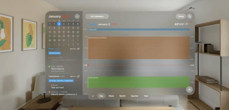 이 앱은 Vision OS에서 기본적으로 지원됩니다. 캘린더와 상호 작용하고, 이벤트를 추가 또는 제거하고, 다른 캘린더의 이벤트를 정렬하는 등의 작업을 수행할 수 있습니다. 이 앱은 무료로 다운로드할 수 있으며 추가 혜택을 제공하는 프리미엄 버전으로 업그레이드할 수 있는 옵션을 제공합니다.